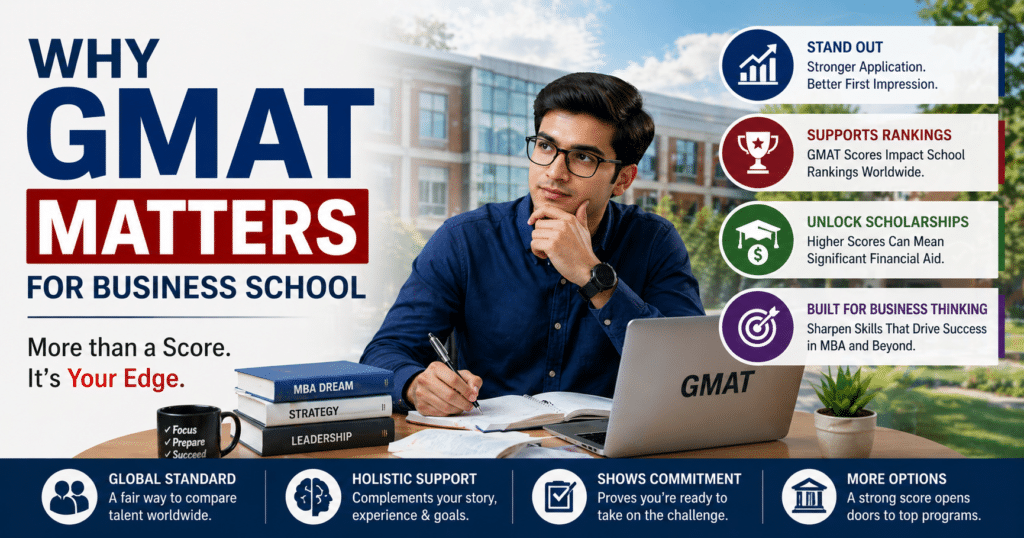 You’ll hear that at every single MBA info session. The admissions rep delivers it with the kind of practiced calm that suggests they’ve said it four hundred times, which they probably have. And it’s not exactly false — but it’s not the whole story either. Talk to enough people who’ve actually been through this process, and a more useful picture starts forming. The GMAT score shows up early. It frames how the rest of your file gets read. That’s just how it works, whatever the brochure says.