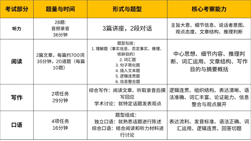 该考试成绩已获得全球众多高校、奖学金项目及专业资格认证考试的广泛认可,对留学深造与职业发展至关重要。考试包含听力、阅读、写作及口语四个部分,每部分成绩区间为0至30分,最终总分(0-120分)由四部分成绩累加计算得出。